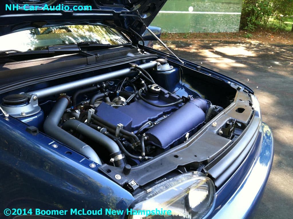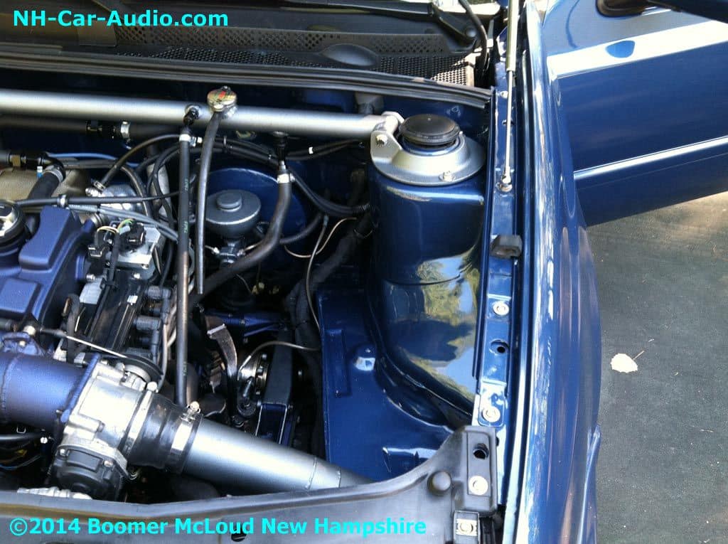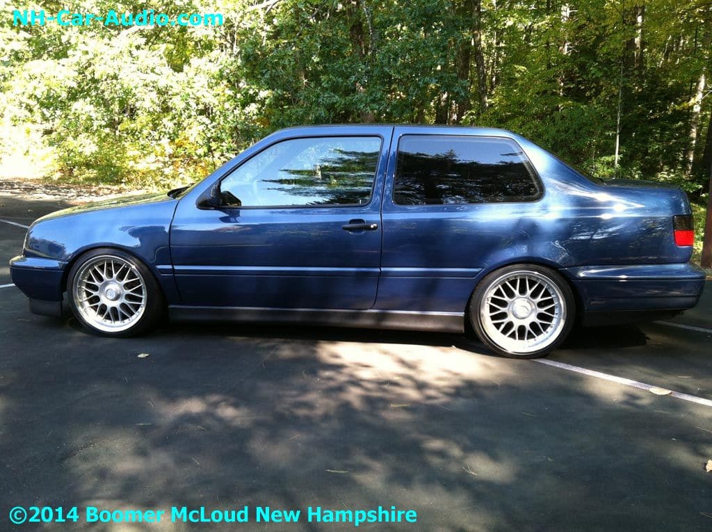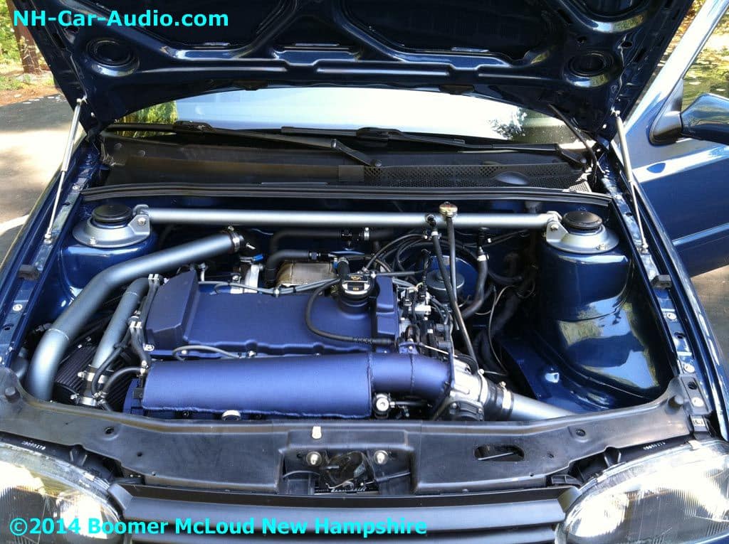 This is Ryan’s (one of us here at Boomers) car…in his spare time, he cut his VW Jetta in half and welded in a rear quarter panel from a VW GTI into where the rear doors used to be. But he didn’t stop there, he also swapped out the motor to a VR6. There’s more, he then supercharged it. This car is a great example of the kinds of custom work we are capable of here at Boomers. In this case, none of these parts are available, so he hand made almost everything. He wanted to keep the motor compartment clear of any plastic containers so he even turned the strut tower bar into a coolant reservoir. This new creation required new (non existent) parts, the hood prop struts and the interior panels couldn’t be found anywhere, as the car doesn’t exist in the parts world as it is a one of a kind. Ryan had to hand make all the interior panels. Continuing with design plan, he even went as far as to swap the steering wheel to a 2012, just to make it different. Check out the speakers, of course, they don’t come like that from the factory. Like many other parts on this car they were all hand made.gallery-spacer