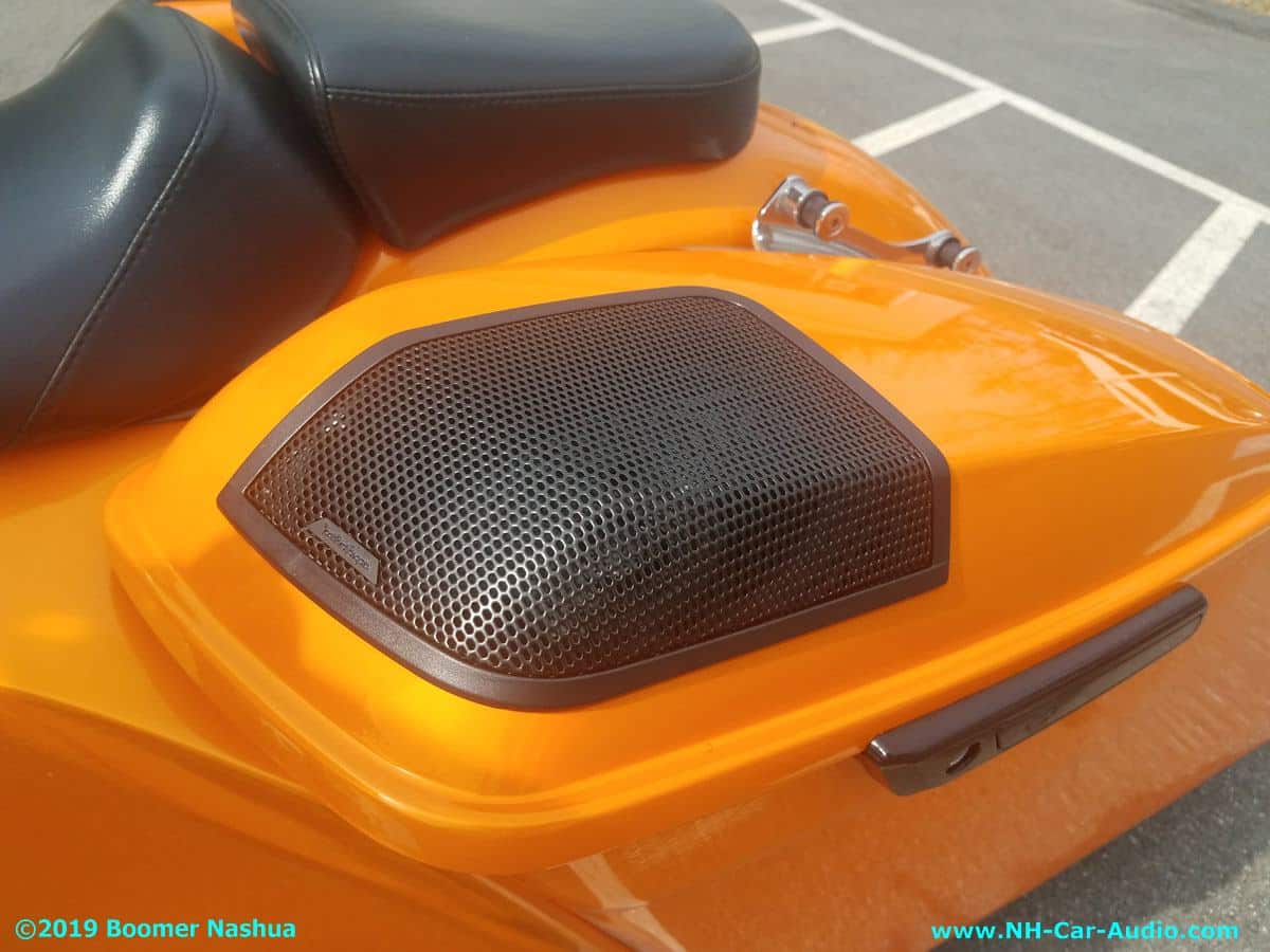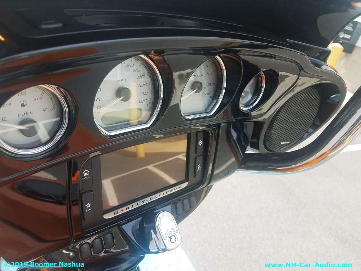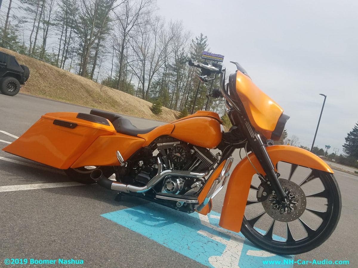 This 2014 Harley Street Glide has a unique sound system upgrade, Boomer Nashua kept the factory radio then added Fosgate components to get really great sound. Our professional installers used specially modified Bag lids to house those great Fosgate speakers. Those bags were the finishing touch for a unique bike with head turning sound.