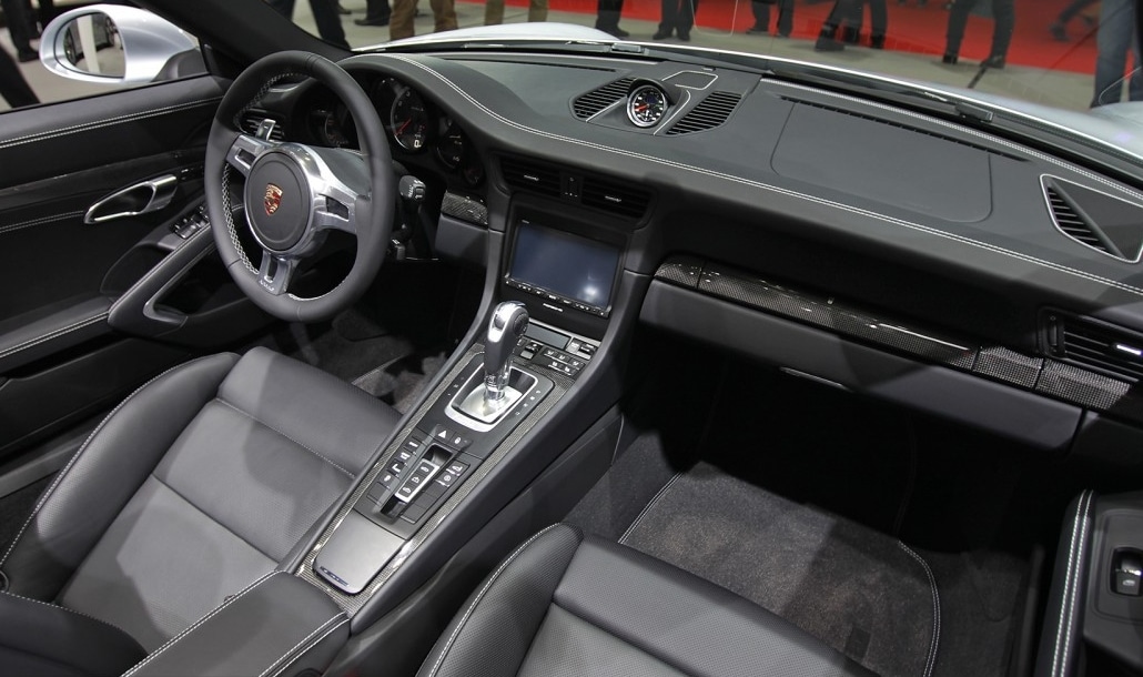 versus ‘factory blank plastic pieces’. Then we mounted the control heads for both systems behind the ‘factory’ Ash tray/Cigarette lighter compartment door right below the buttons. The Beltronics STiR system required a mode display panel. We handled that by modifying the factory rear view mirror so we could fit the STiR display inside. This was no small feat and certainly worth every penny when you see the results. This was a very nice integration, both systems meld together to provide great radar solution. We missed taking a picture with the console door shut, so we provided one from a similar Porsche 911 Cabriolet.